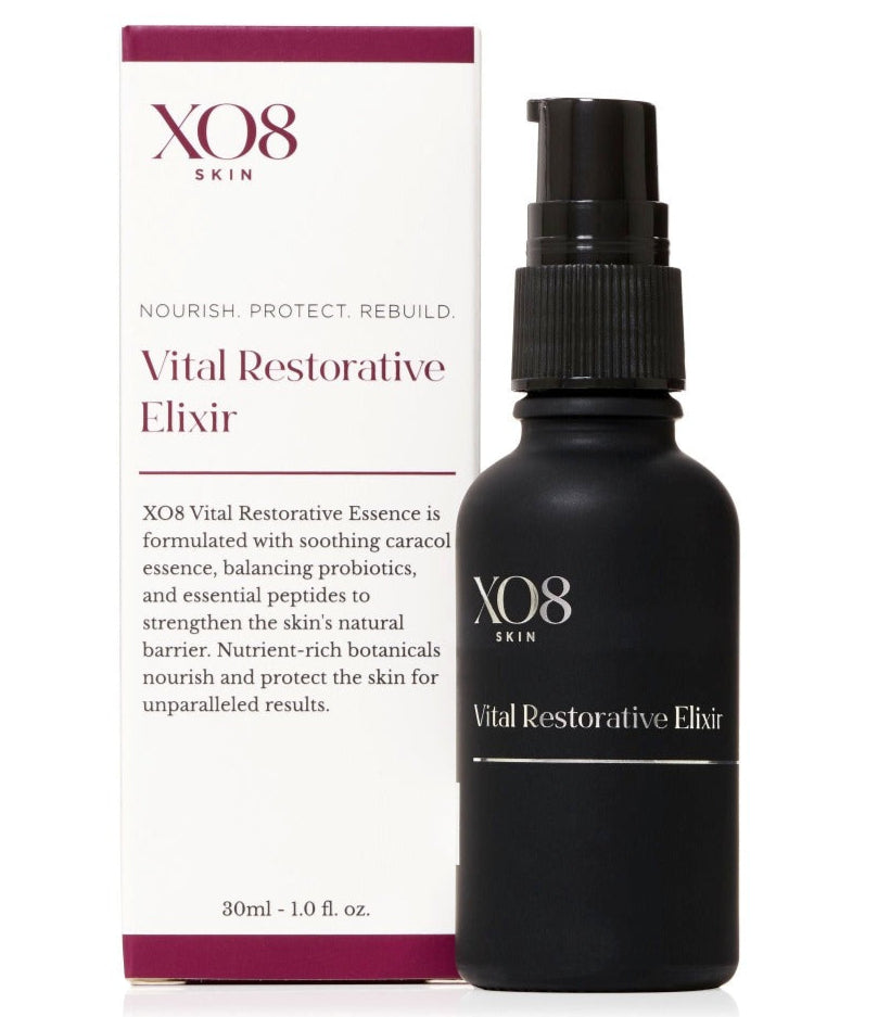XO8 Vital Restorative Elixir combines powerhouse ingredients to defend and revitalize skin. Caracol essence, probiotics, and peptides bolster the skin's natural shield while active botanicals nourish and safeguard skin for enviable effects. BENEFITS: Refines texture Checks production of AGE’s Combats free radicals Enhances collagen in skin Cuts TEWL (trans-epidermal water loss)